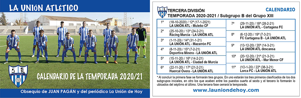 Juan Pagán y el periódico La Unión de Hoy (en su décimo aniversario) regalan tarjetas (para poder ser guardado cómodamente en la cartera) con todos los partidos del equipo unionense de Tercera División. También se han dejado en algunos comercios de la ciudad. Si los ves, sólo tienes que cogerlo para estar día de los partidos que tiene el conjunto blanquiazul esta temporada 2021/22.