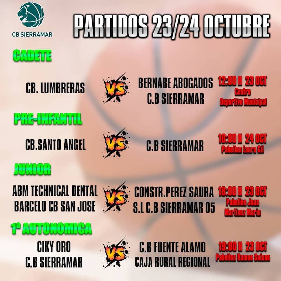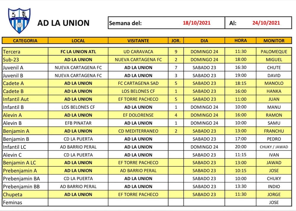 La Unión Atlético de la tercera federativa recibe al Caravaca, que lleva un punto más que los de Palomeque en la clasificación, con lo que será un partido clave para salir de la zona de cola. Dentro del fútbol, el juvenil de Portmán visita a Los Belones. Por su parte, el nuevo equipo sub-23 de la AD La Unión se estrena como local tras iniciar la liga con derrota ante la EF Esperanza (2-1). En baloncesto, el equipo sénior juega en La Unión, mientras que viajan los otros tres que tiene compromisos. En fútbol sala tienen partidos el cadete y el infantil del CD Vedruna.