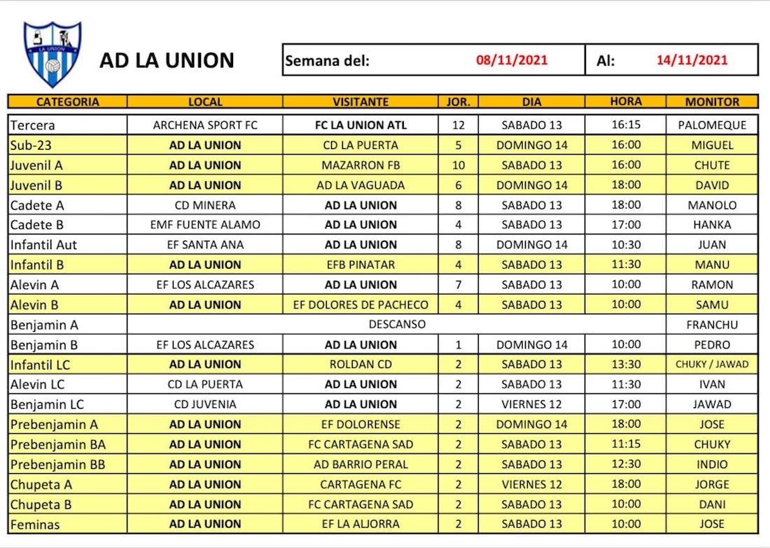 La Unión Atlético visita a un Archena que lo supera en cuatro puntos y frente al que tratará de acercase en la clasificación de tercera federativa. También recogemos los horarios de las bases de fútbol de la AD La Unión y Portmán Atlétic y de los equipos de baloncesto del CB Sierramar, de voleibol del Surmenor y de fútbol sala del Vedruna. El fin de semana deportivo lo completa el XII duatlón cross minero que tendrá lugar el domingo.