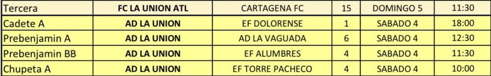 La Unión Atlético recibe al Cartagena ‘Efesé’ este domingo a las 11.30 horas, mientras que en fútbol base sólo hay cuatro partidos este fin de semana para la AD La Unión. Por su parte, dos equipos de voleibol de base de la AD Algar Surmenor juegan en Roche. No hay partidos para AD Portmán Atlétic, Club Baloncesto Sierramar y CD Vedruna de fútbol sala.
