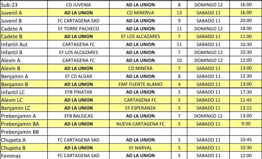 El trofeo 'Alcalde de La Unión' protagoniza la matinal del domingo con la carrera y el cross canino. Esa mañana, La Unión Atlético de la tercera federativa visitará al filial del Real Murcia, un rival directo en la lucha por estar en la zona alta de la clasificación. Ofrecemos horarios de fútbol, fútbol sala y baloncesto.