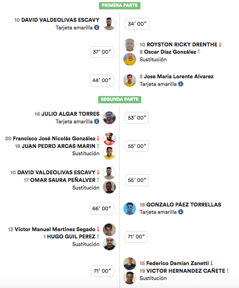 A la hora de juego, el técnico local, Palomeque, efectuó dos cambios para darle un poco mas de brío a los suyos, siendo Arcas y Omar los que entraron en el terreno de juego.