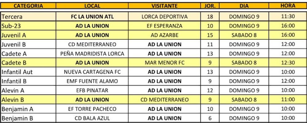 Vuelven las competiciones deportivas federadas, aunque no para todos nuestros equipos. En la tercera federativa de fútbol, La Unión Atlético afronta un partido clave para sus aspiraciones, pues recibe al Lorca, que es quinto en la clasificación con un punto más que los mineros. En fútbol base, once equipos de la AD La Unión y uno de Portmán tienen partidos, mientras que en voleibol son cuatro los equipos de la AD Algar Surmenor que juegan en Roche. Respecto al baloncesto, la federación autonómica ya suspendido la jornada por el coronavirus.