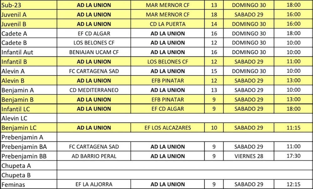 El pabellón de Roche acoge este fin de semana partidos de voleibol femenino de La Unión-Algar y del fútbol sala del CD Vedruna, que también tiene encuentros en La Unión, al igual que el CB Sierramar de baloncesto También ofrecemos fechas y horarios de los equipos balompédicos del Portmán Atlétic y de la AD La Unión. Por otro lado, apuntar que el coronavirus obliga a cancelar los partidos de La Unión Atlético en la tercera federativa de fútbol y del cadete A de voleibol.