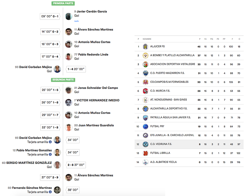 Liga autonómica cadete (Grupo II): CD Vedruna-ED Abanilla (3-2), en el pabellón Ramón Solano de La Unión. Los locales se pusieron con ventaja de tres goles a los 26 minutos tras los tantos conseguidos por Julio García, Juan Miguel García y Adrián Palomo. Aunque el rival respondió con dos tantos enseguida (3-2 en el minuto 32), lograron salvaguardar la victoria.