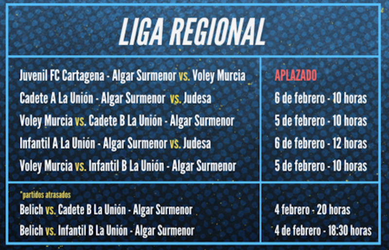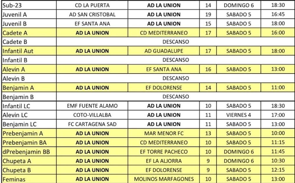 Fechas y horarios de los partidos de la AD La Unión y Portmán Atlétic, en fútbol; CB Sierramar, en baloncesto; AD La Unión-Algar, en voleibol; y CD Vedruna, en fútbol sala, este fin de semana en las competiciones federadas autonómicas.