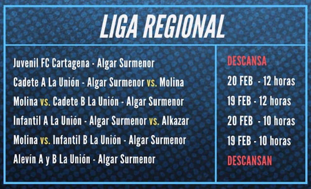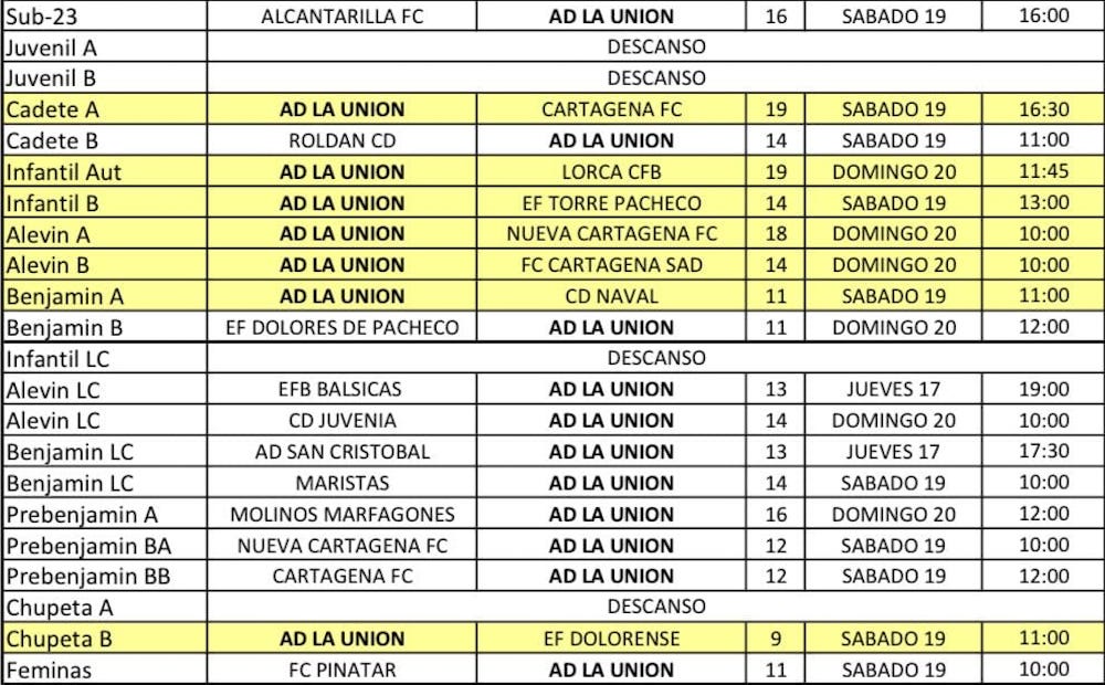 Fechas y horarios de los partidos de las ligas federadas autonómicas de los equipos La Unión Atlético, AD La Unión y Portmán Atlétic en fútbol; CB Sierramar en baloncesto; La Unión-Algar Surmenor en voleibol femenino; y CD Vedruna en fútbol sala.
