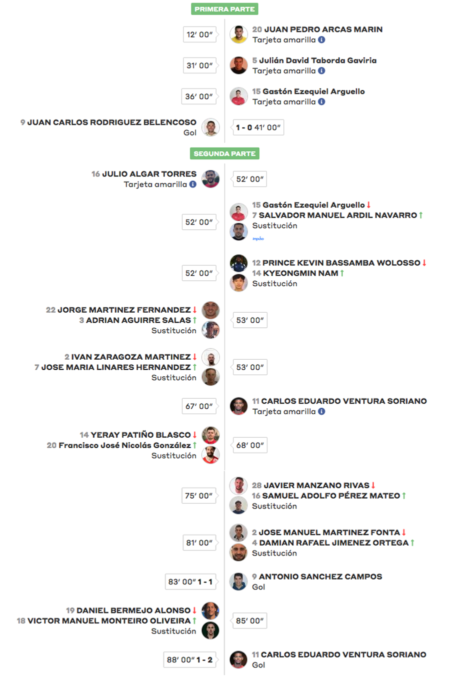 GOLES. 1-0.Minuto 41: Belencoso. 1-1.Minuto 84: Nono. 1-2.Minuto 89: Ventura.