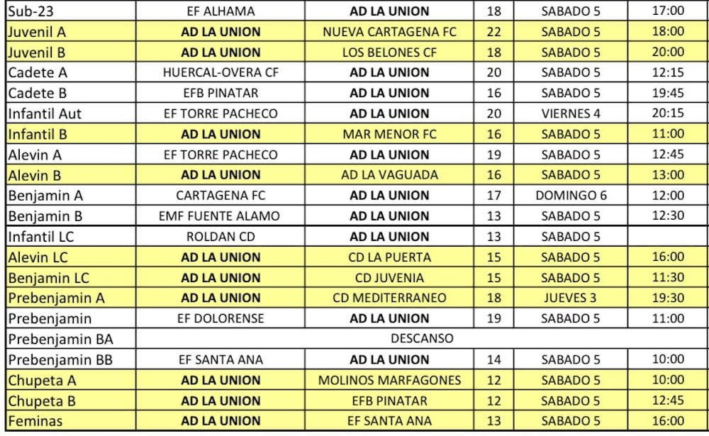 📌. En el plano deportivo ofrecemos horarios de los partidos del fin de semana de los equipos federados autonómicos de La Unión Atlético, AD La Unión, Portmán Atlétic, CB Sierramar, La Union-Algar Surmenor y CD Vedruna.