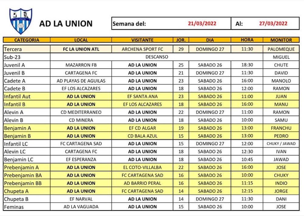 Los dos equipos juveniles de La Unión-Algar Surmenor juegan contar el Alkazar (10 horas del domingo en Los Alcázares) y Belich (domingo 19 horas en casa)