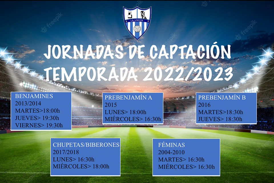 La escuela de fútbol de la AD La Unión inicia las pruebas este lunes para las categorías sub-23 (nacidos en 2000 a 2003), juvenil (2004-2006), cadetes (2007-2008), infantiles (2009-2010), alevines (2011-2012), benjamines (2013-2014), prebenjamines (2015-2016), chupetas/biberones (2017/2018) y féminas (2004/2010).