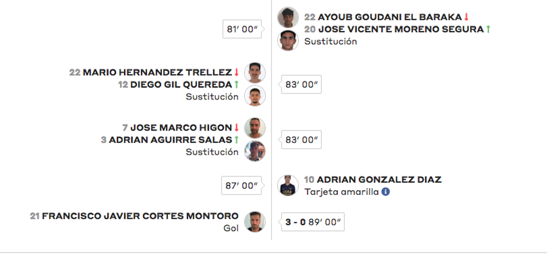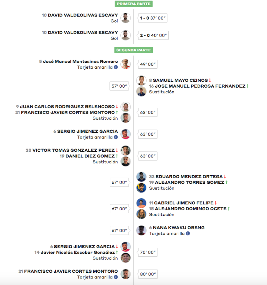 Goles: 1-0 ( Valdeolivas 37′), 2-0 (Valdeolivas 40′), 3-0 ( Fran Cortés 90+3′).