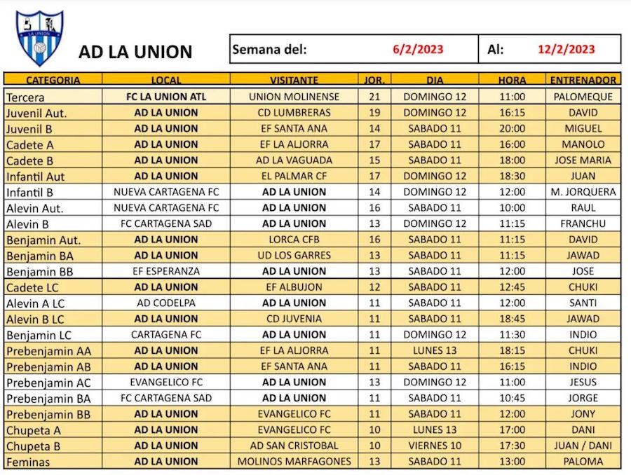 Fechas, horas y rivales de los equipos del CD Vedruna de fútbol sala; La Unión Atlético, AD Portmán y AD La Unión de fútbol, y El Algar-La Unión de voleibol en este fin de semana. En la imagen, el benjamín de fútbol base de la liga autonómica federada tras su victoria en la última jornada.