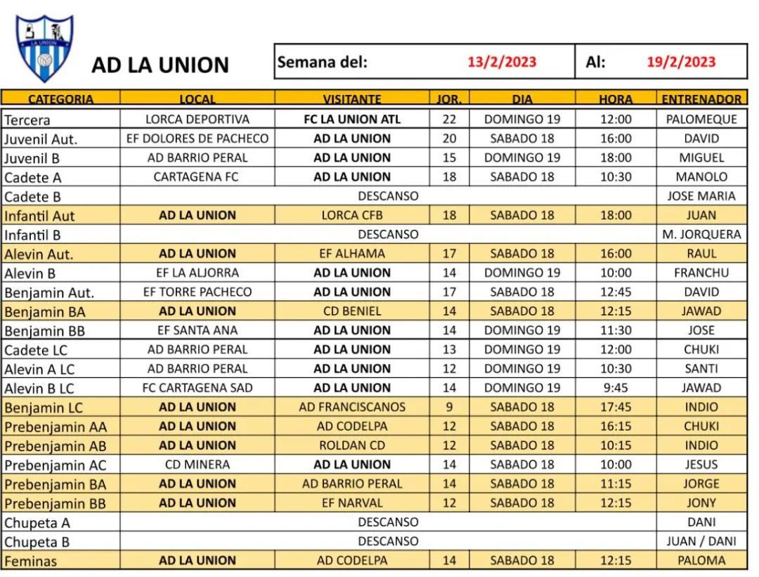 Fechas, horarios y rivales de los compromisos del fin de semana de los equipos de La Unión Atlético, AD La Unión y Portmán Atlétic de fútbol base, CB Sierramar de baloncesto, CD Vedruna de fútbol sala y El Algar-La Unión de voleibol. Fuera del deporte destaca la cena-gala de la Cofradía del Cristo de los Mineros este sábado. La foto adjunta corresponde al equipo prebenjamín AA unionense tras ganar a La Aljorra por 11-1.