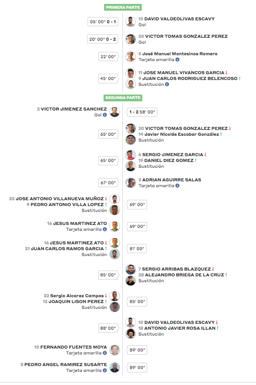 Palomeque repetía el mismo esquema que la pasada excepto la inclusión de Valdeolivas en detrimento de Tato. El equipo salió enchufado desde el minuto uno y pronto se encontraría con el primer gol. Un grandísimo centro desde la banda izquierda de Walter sirvió para que Valdeolivas con la testa pusiera el balón fuera del alcance del meta local.
