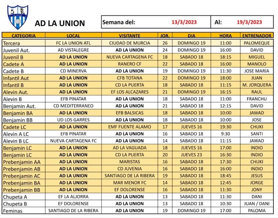 Rivales, fechas y horarios de los partidos de las diferentes ligas que afrontan entre hoy y el domingo los equipos del municipio unionense en fútbol sala, fútbol, baloncesto y voleibol. En la foto adjunta se observa el plantel del CB Sierramar de categoría benjamín femenino.
