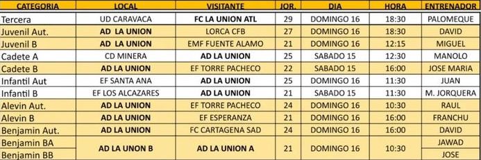 Las competiciones vuelven a la actividad tras la Semana Santa. Ofrecemos las fechas, horarios y rivales de los equipos de fútbol de La Unión Atlético, AD Portmán Atlétic y AD La Unión, del CD Vedruna de fútbol sala, de El Algar-La Unión en la fase final regional de voleibol femenino juvenil y de baloncesto con la XIV Liga Local y el CB Sierramar, quien además de los partidos de liga tiene como epicentro este sábado la presentación de sus equipos. En la foto, la escuadra infantil.