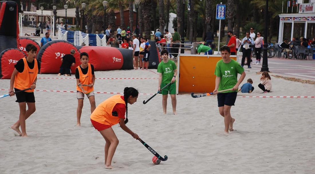 La asociación deportiva de hockey de La Unión ha sido el premiado por la federación autonómica de este deporte en la gala del deporte regional de la Unión de Federaciones Deportivas de la Región de Murcia. En la foto, jugadores y técnicos durante su participación este pasado fin de semana en el 'Sport4Cáncer-Mar Menor Games' que se ha celebrado en la playa de Los Alcázares, junto a equipos de Santomera, Murcia y el anfitrión.