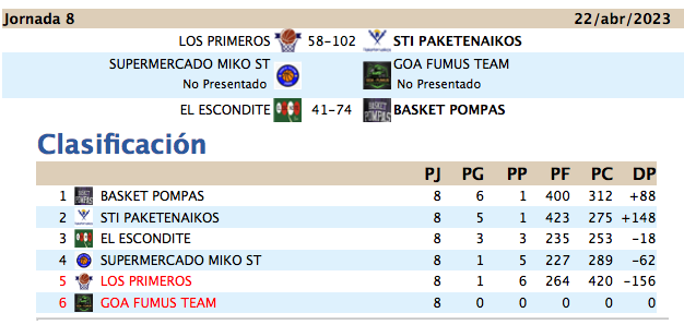 Sti Paketenaikos ganó a Los Primeros por 58-102 y Basket Pompas superó a El Escondite por 41-74 en los dos partidos disputados de la octava jornada de la fase regular del XIV campeonato local 'Ciudad de La Unión'. Estos dos equipos triunfadores son los que encabezan la clasificación y los que se enfrentarán entre sí este sábado por la tarde.