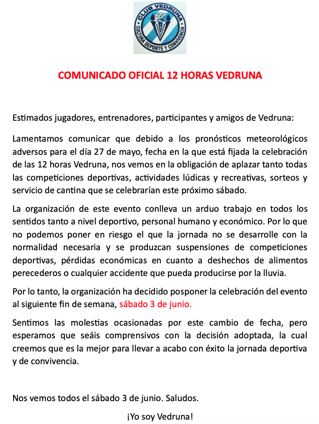 La organización informa que, debido a la previsión de lluvias para este sábado, la jornada de actividades deportivas, lúdicas y recreativas se traslada al 3 de junio.