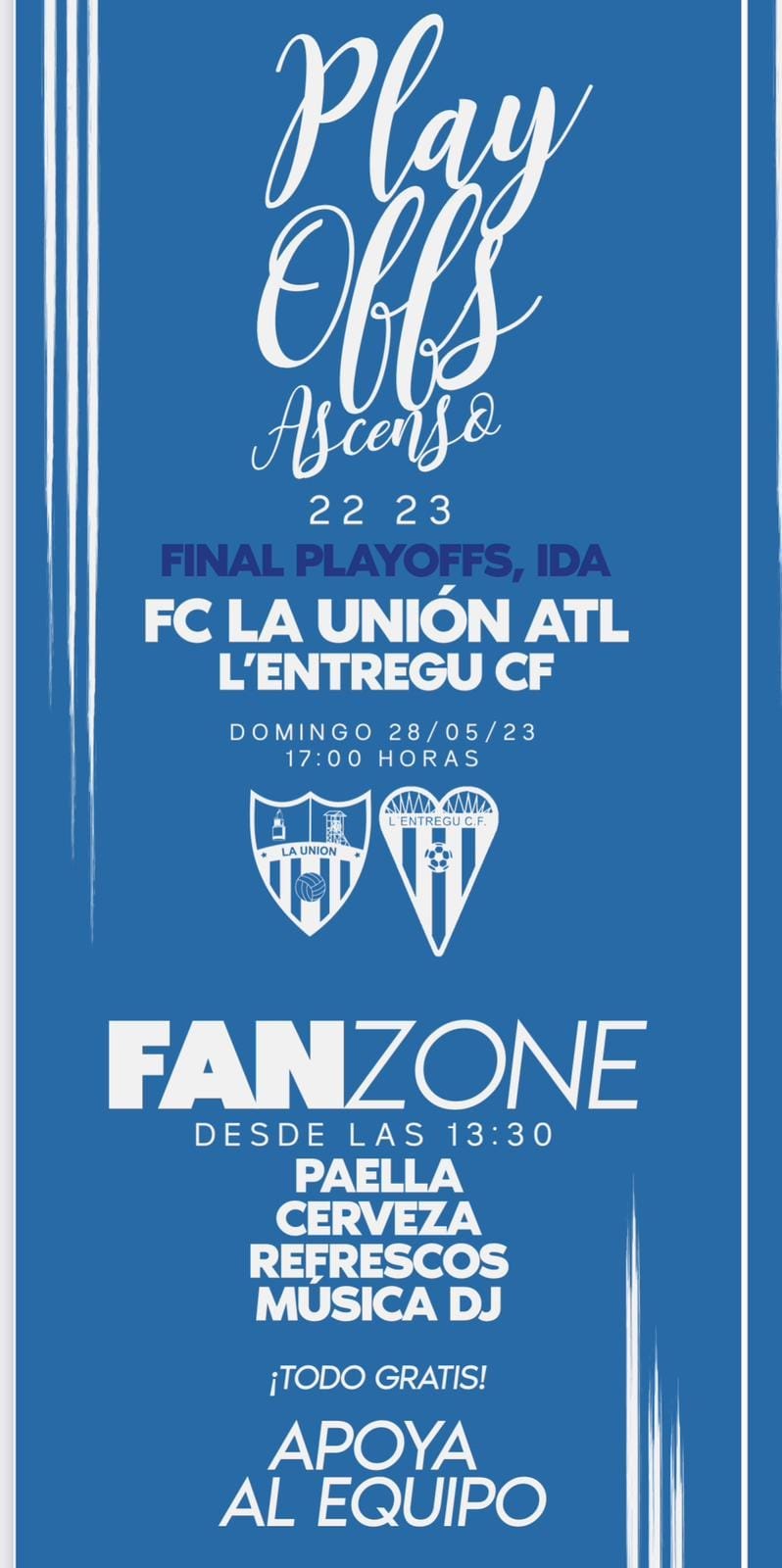 La Unión Atlético, al igual que ha organizado en las eliminatorias contra Rácing Murcia y Lorca Deportiva, celebrará una fiesta previa (con arroz y bebidas gratuitas y música de dj) al partido de la lucha por el ascenso a segunda RFEF frente al L’Entregu CF, indicando que los que acudan a la ‘Fan Zone’ que tendrá lugar en el polideportivo Antonio Sánchez tendrán entrada gratuita para el crucial encuentro.