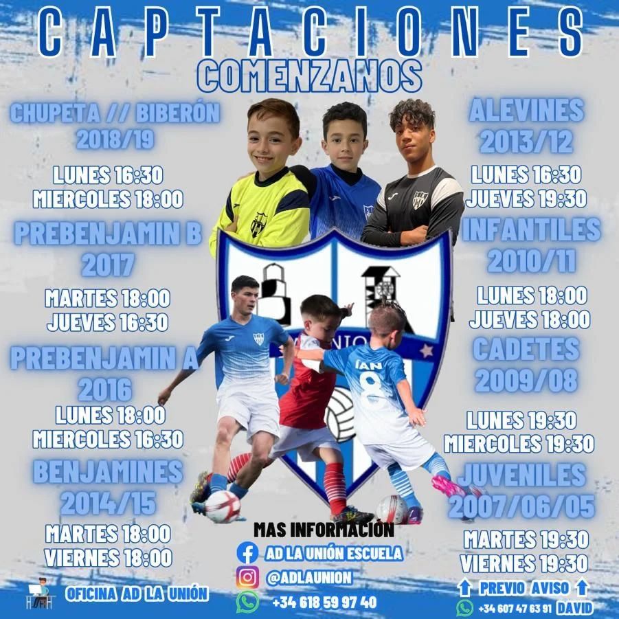 La escuela de fútbol de la AD La Unión convoca pruebas en categorías chupeta biberón, prbenjamín, benjamín, alevín, infantil, cadete y juvenil a partir del lunes próximo.