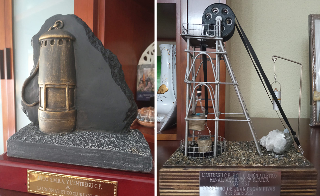 El Ayuntamiento de El Entrego y L'Entregu CF entregaron en el partido de ida a La Unión Atlético un trofeo que reproducía una piedra de carbón con un carburo incrustado y este pasado domingo hubo una placa dirigida al club minero del sureste español con el texto: 'La afición de L'Entregu en reconocimiento a La Unión Atlético por su gran temporada y el buen trabajo recibido por su afición'. Por su parte, el unionense Juan Pagán, fiel seguidor del equipo y colaborador de La Unión de Hoy, obsequió en el campo de Nuevo Nalón al club minero asturiano y a sus aficionados una reproducción de un castillete con malacate. El trofeo lo recibió Alberto Benito, el portero y capitán del equipo local, además de concejal del PP del consistorio del pueblo del valle minero.