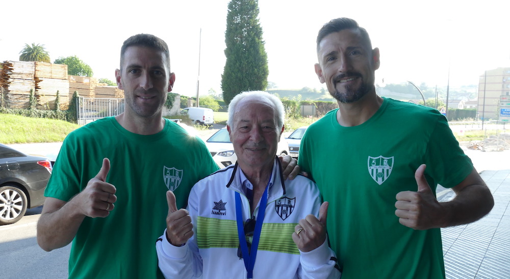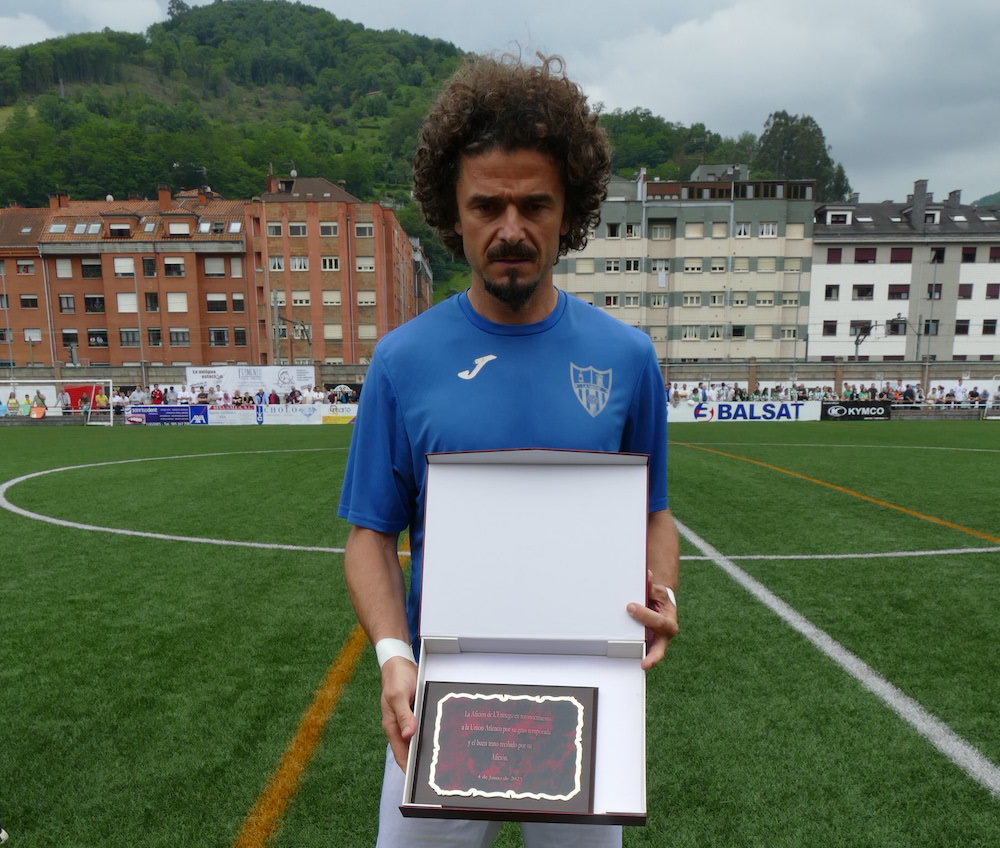 El futbolista Javi Rosa con la placa recibida de los asturianos el 4 de junio.