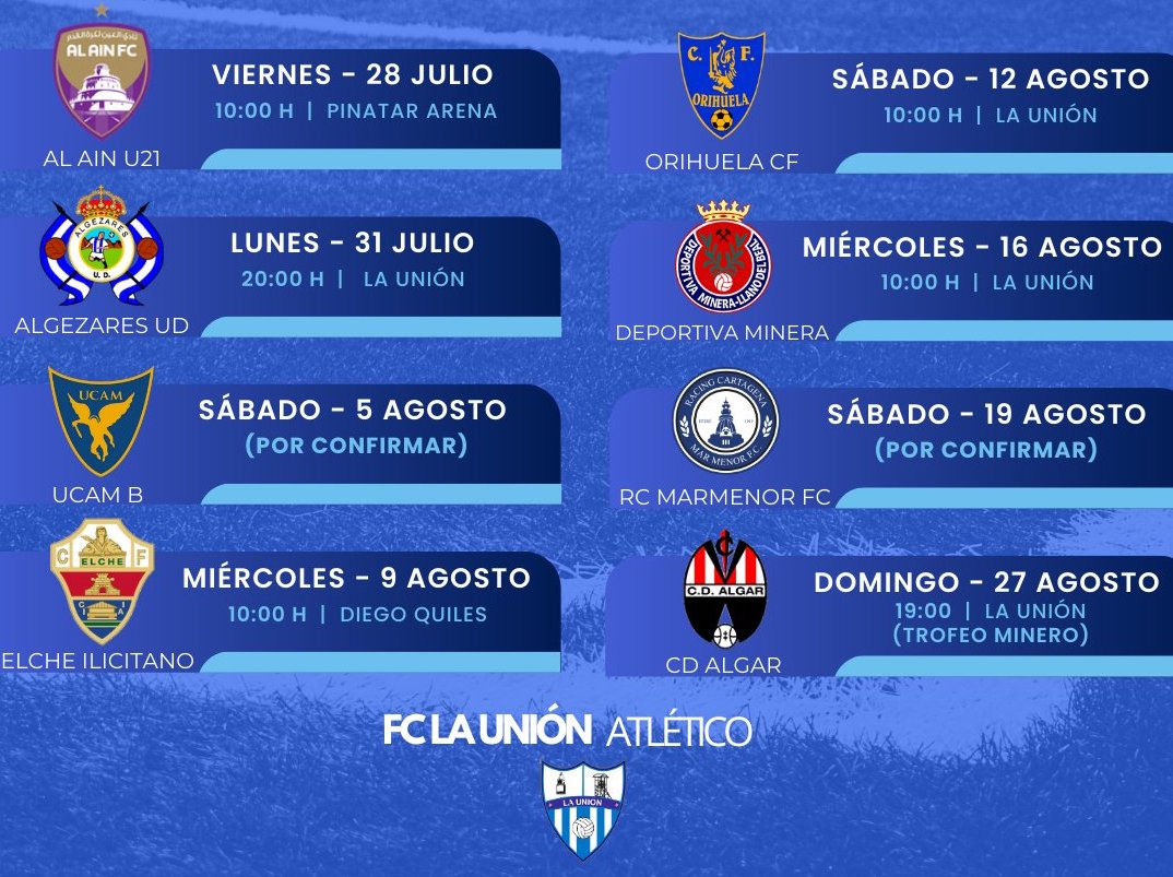 El equipo blanquiazul, que esta tarde, a las 19 horas, comienza los entrenamientos bajo las órdenes de Palomeque en el polideportivo Antonio Sánchez, comenzará los 'bolos' el 28 de julio frente al Al Ain U21 de Emiratos Árabes, después tendrá como rivales al Algezares, Ilicitano, Orihuela y Deportiva Minera, quedando por confirmar el escenario para los enfrentamientos contra UCAM Murcia B y RC Mar Menor FC. Acabará el 27 de agosto con la disputa del Trofeo Minero frente al CD Algar.