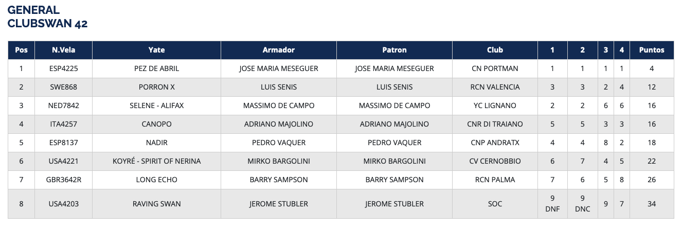 Los líderes al término de la segunda jornada son: Palibex-Elena Nova (ESP) en Majorica ORC 1, Teatro Soho Caixabank (ESP) en Majorica ORC 2, Scugnizza (ITA) en Majorica ORC 3, Just the Job (GBR) en Majorica ORC 4, Cuordileone (ITA) en ClubSwan 50, Pez de Abril (ESP) en ClubSwan 42, Dorsia Covirán (ESP) en Mallorca Sotheby’s Women’s Cup y Patakín (ESP) en Herbalife J70.