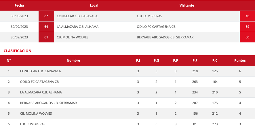 Júnior (Grupo plata - jornada 3): CB Molina - CB Sierramar Bernabé Abogados (61-60), disputado en el pabellón Polígono El Romeral 1 de Molina de Segura