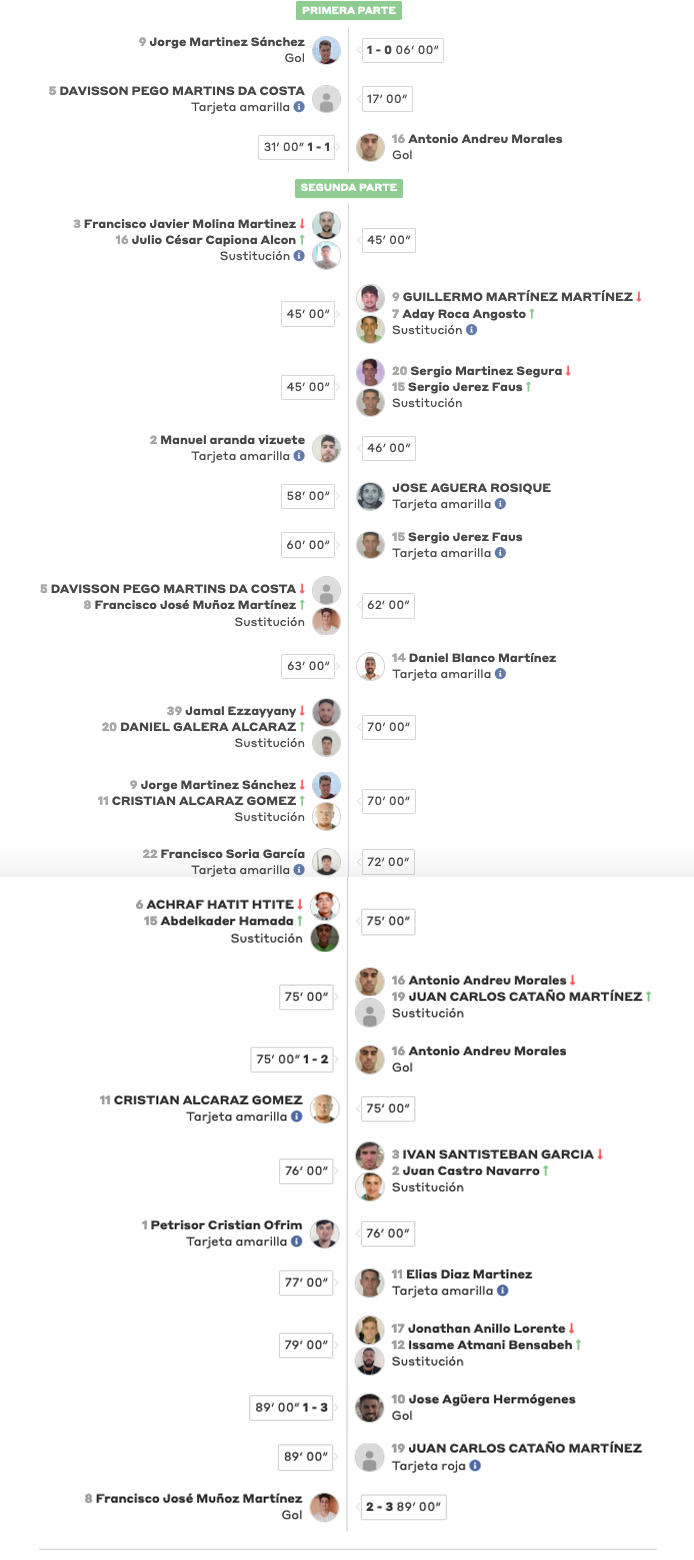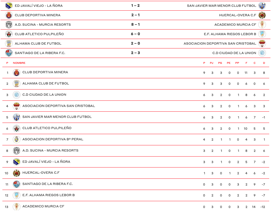 El CD Ciudad de La Unión comenzó perdiendo en el campo del Santiago de la Ribera, pero remontó con dos goles de Antonio Andreu. Empató después el cuadro de San Javier, pero el marcador cayó del lado minero merced a un gol de José Agüera al rematar una falta botada en el último minuto.