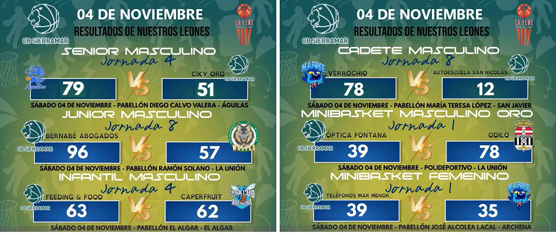 Júnior - Grupo plata: Bernabé Abogados CB Sierramar-CB Molina (96-57), en el pabellón Ramón Solano de La Unión. Tercer triunfo del CB Sierramar, que se coloca cuarto en su grupo, a dos victorias del CB Alhama, que es tercero, y a cinco del Caravaca, líder y próximo rival.