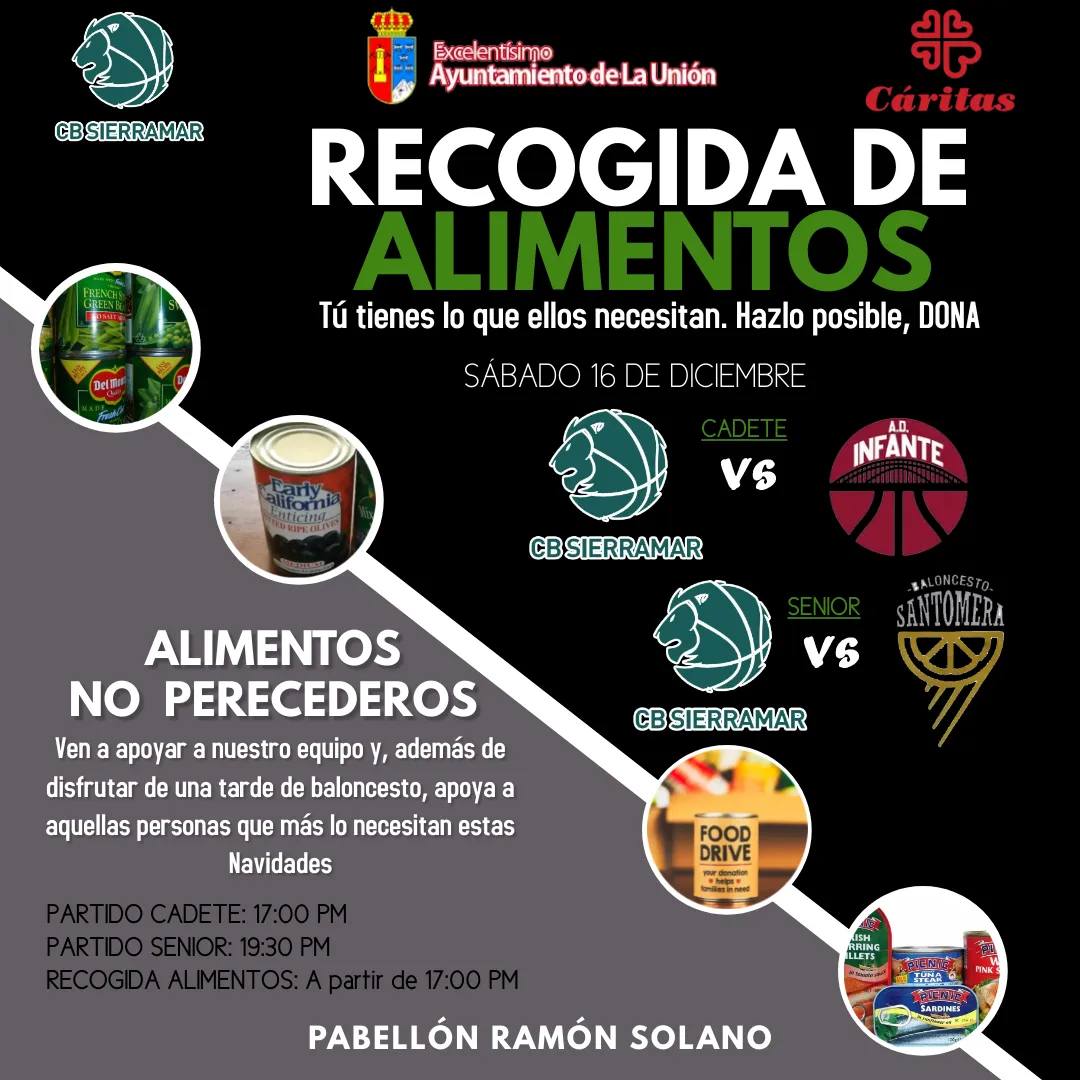 El Club Baloncesto Sierramar lleva a cabo este sábado por la tarde la campaña navideña de recogida de productos no perecederos que serán entregados a familias necesitadas. Tendrá lugar en el pabellón Ramón Solano de La Unión a partir de las 17 horas y durará mientras se disputan los partidos de liga las escuadras cadete y sénior.