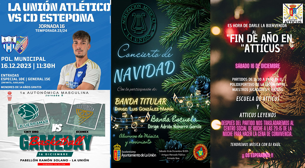 Animado fin de semana con las dos jornadas finales del festival literario 'iLuro' y el concierto de la Agrupación Musical La Unión, que se suman a la amplia agenda deportiva para La Unión Atlético, Ciudad de La Unión, AD La Unión, AD Portmán, CD Vedruna, AD Algar Surmenor y CB Sierramar. Este último club y los caballeros de Santa Bárbara tiene un sábado solidario hacia las personas necesitadas. A todo esto se suma la concentración de vehículos clásicos de Roche y la campaña 'Yo compro en La Unión' que sigue abierta hasta final de Navidad.