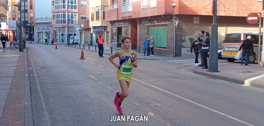 Alevín. 1º David Jiménez Naveira, con 3'344". 2ª Emma Sánchez, a 16". 3ª Emma Navarro, a 17". Los tres son del Club Atlétismo La Unión, al igual que Elena Pérez, quinta a 26".