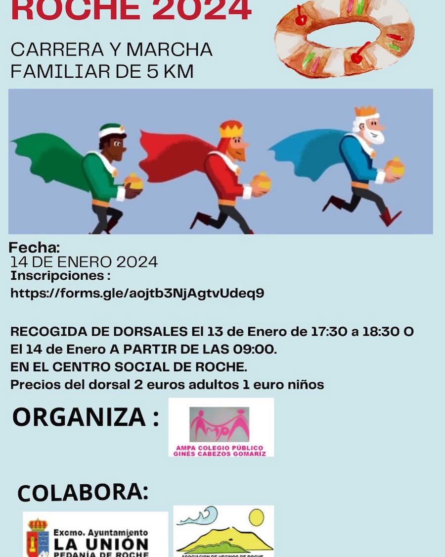 Roche celebra este domingo por la mañana una carrera y una marcha familiar de 5 kilómetros. El precio de los dorsales es de 2 euros para adultos y uno para niños. Organiza el AMPA del colegio público Ginés Cabezos Gomariz con la colaboración de la asociación de vecinos y del Ayuntamiento de La Unión.