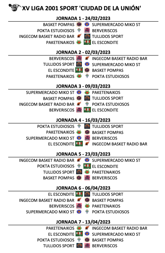 Basket Pompas defenderá el título como vigente campeón ante Paketenaikos (subcampeón), Supermercado Miko, Pokta Estudiosos, Berveriscos, Basket Radi Bar, Tullidos Sport y El Escondite en un campeonato que arranca esta semana y que acogerá la disputa de todos su partidos en la tarde de los sábados en el pabellón de La Unión. La liga concluirá el 13 de abril y después comenzarán los emparejamientos de la fase final.