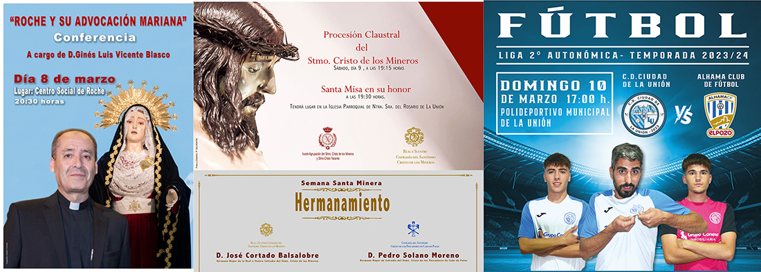 Rivales, fechas y horarios de los partidos de los equipos unionenses de fútbol, fútbol sala y voleibol. Fuera del deporte, charla esta noche en Roche, feria de la igualdad en la mañana del sábado en la ciudad, mientras que por la tarde es la procesión claustral del Crsito de los Mineros, dejando para el domingo el hermanamiento procesionista con Cabo de Palos.