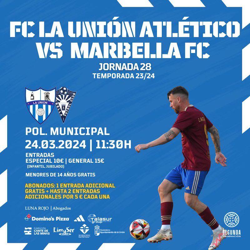 FC La Unión Atlético tendrá este Domingo de Ramos (11.30 horas) el segundo partido consecutivo como local y quiere que el polideportivo sea un seguro de puntos. En este caso, recibe a una de los más potentes de la categoría, Marbella FC. Para potenciar la presencia de aficionados, cada abonado dispone de una entrada adicional gratis y dos adicionales por 5 euros cada una. En la primera vuelta (foto adjunta), ganó el equipo malagueño con un tanto en el minuto 94.