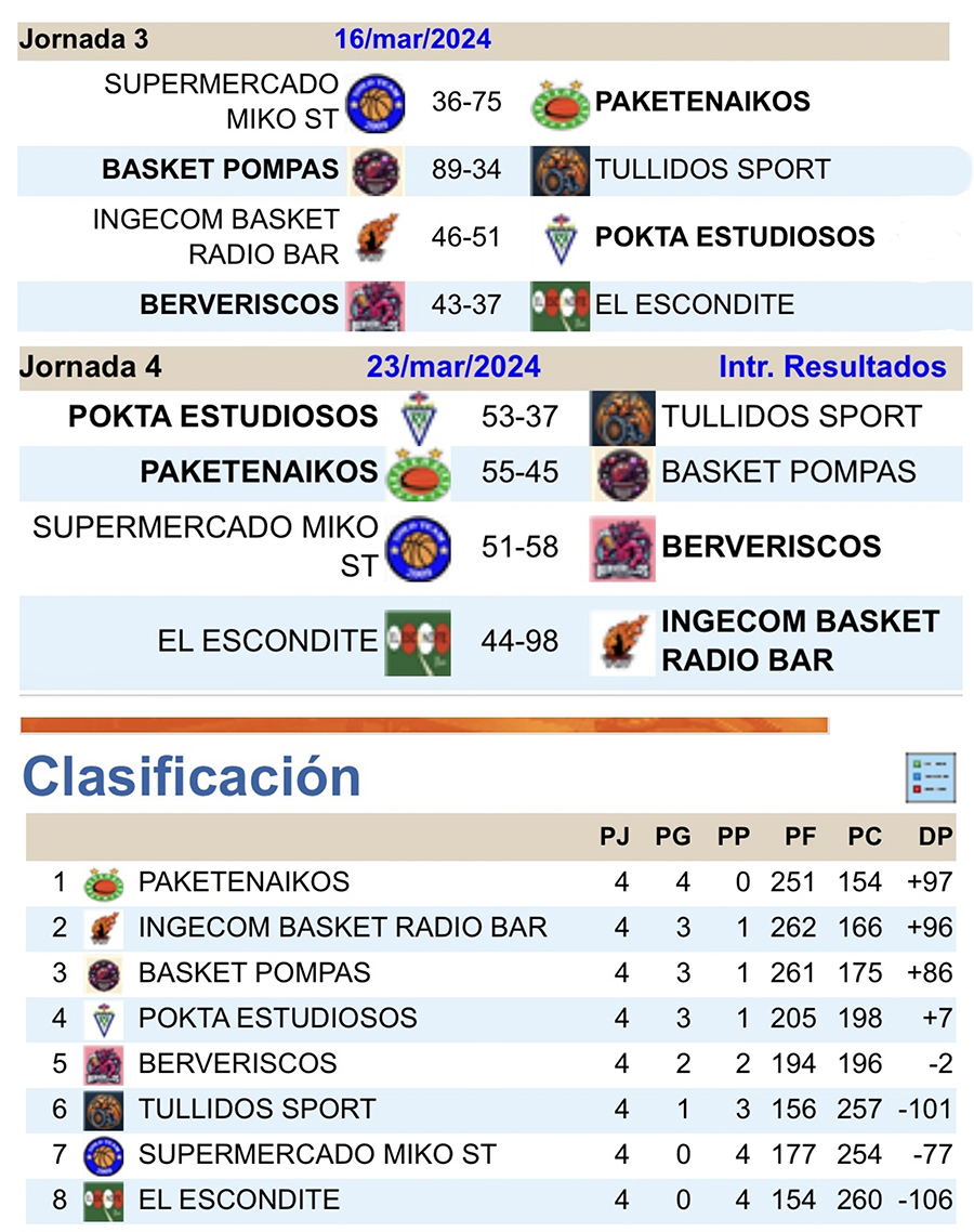 Paketenaikos llega al descanso por Semana Santa como líder en solitario al haber saldado los cuatro partidos disputados con victorias. En el segundo puesto hay tres conjuntos empatados a tres triunfos y en la cola aún no conocen el sabor de ganar Miko y El Escondite. La liga, que está siendo un buen foco de atracción de espectadores a 'La Bombonera', se reanudará el 6 de abril.