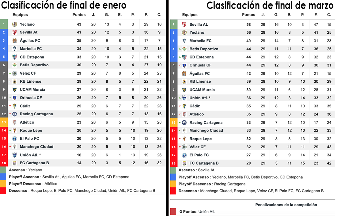 Viendo estos números, se entiende porqué el Águilas se ha salido de los puestos de la fase de ascenso, porqué el Yeclano perdió el liderato, la gran ascensión del Orihuela y la desbandada de futbolistas que sufrió el Vélez. También cobran aún más valor las dos últimas victorias de La Unión Atlético sobre Marbella y Real Betis, que, como se observa, estaban en buena forma y en zona de privilegio.