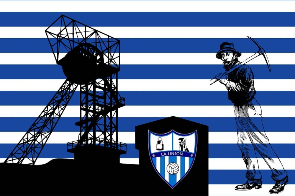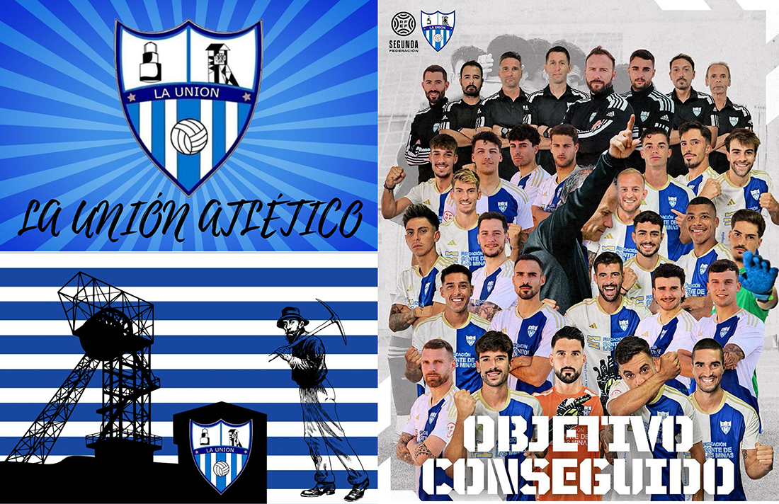 A la izquierda se observa el dibujo elaborado por Afán Sánchez, un joven vecino y gran aficionado, que ha fusionado sobre la bandera blanquiazul el escudo del club con vinculaciones mineras de esta tierra. A la derecha, el póster elaborado por el club con los rostros de quienes han terminado la temporada logrando evitar el descenso.