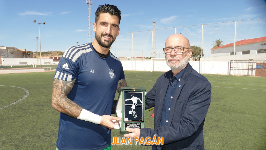 Joyería Gijón ha entregado al meta Ángel de la Calzada el trofeo como mejor jugador de la temporada 2023/24 de La Unión Atlético en Segunda RFEF