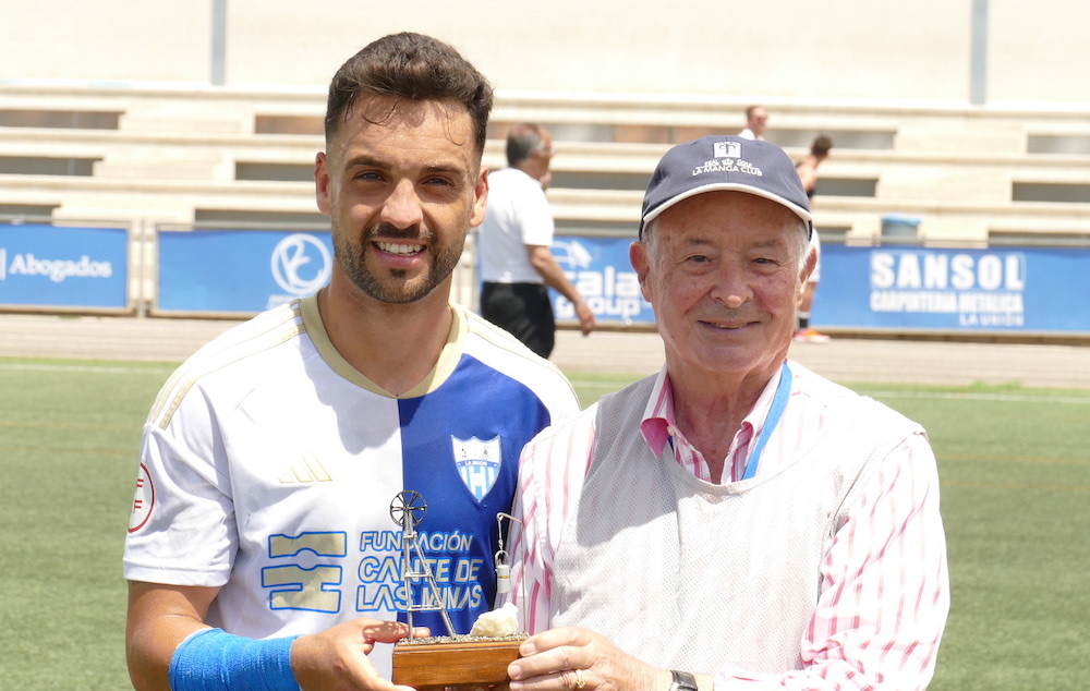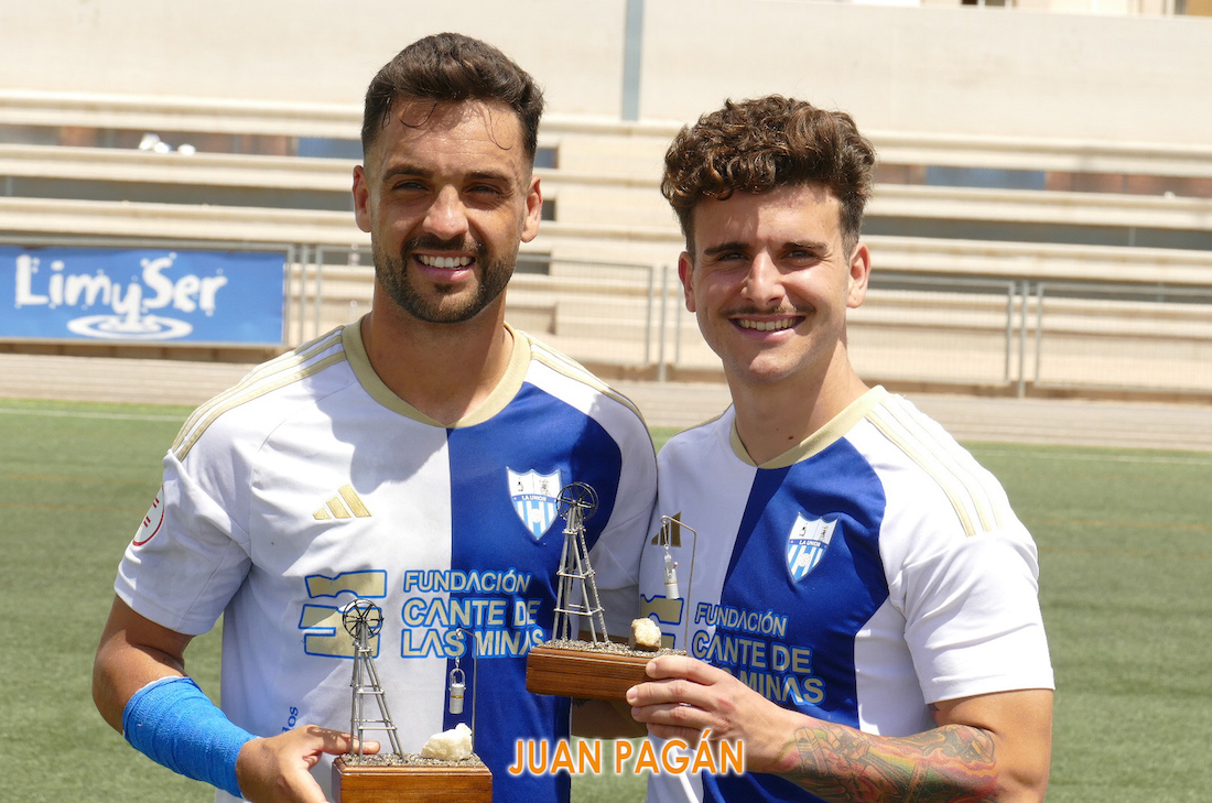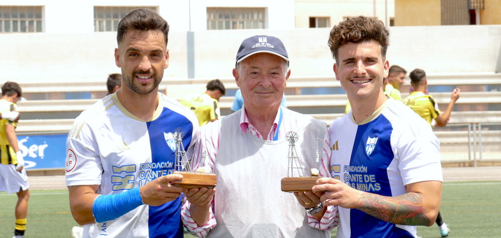 Juan Pagán, colaborador y fotógrafo de La Unión de Hoy, además de gran y fiel seguidor del fútbol minero, ha llevado a cabo la entrega del trofeo que concede al máximo goleador del primer equipo de fútbol de la ciudad, dándose en este caso doblete al empatar Javi Grillo y Alberto Salido.