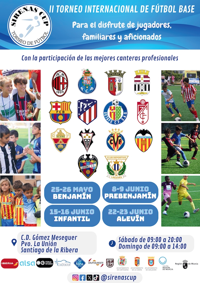 Cartagena acoge en mayo y junio la celebración de la segunda edición del torneo internacional de fúbol base Sirenas Cup, que se desarrolla también en La Unión y Santiago de la Ribera (San Javier). La Ciudad Deportiva Gómez Meseguer, ubicada en el polígono Cabezo Beaza, acogerá los encuentros que se disputen en el municipio.