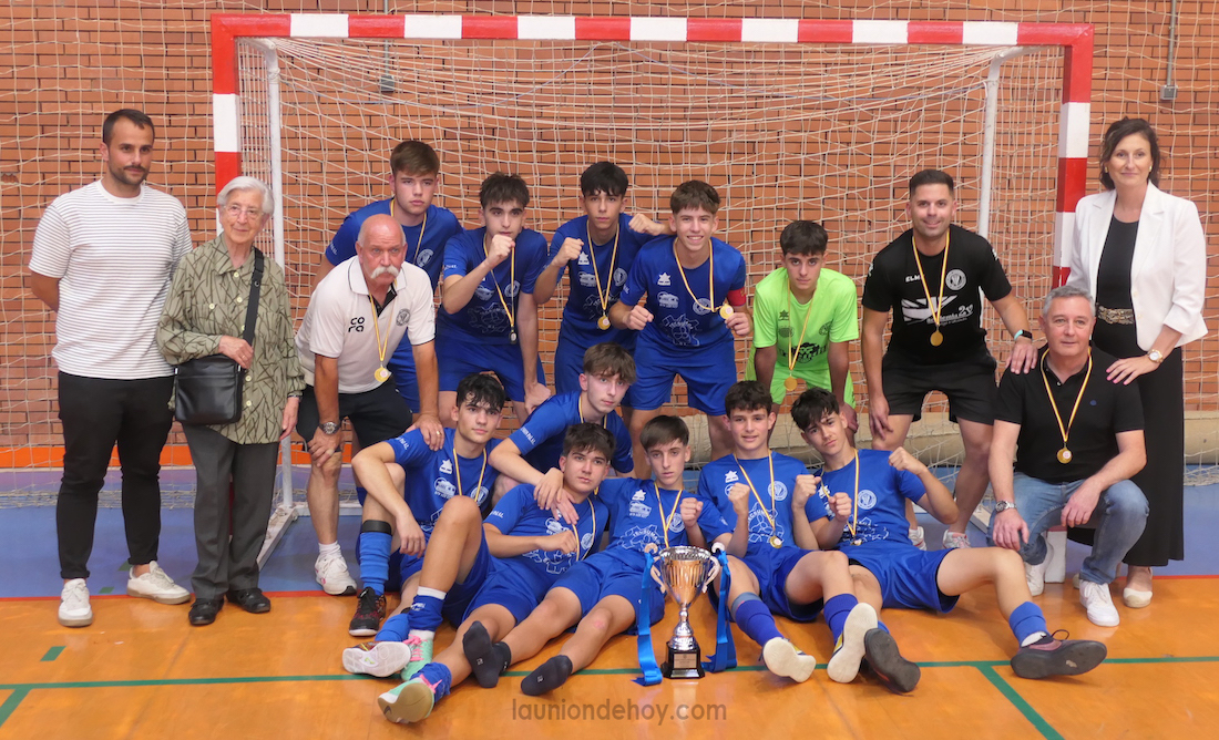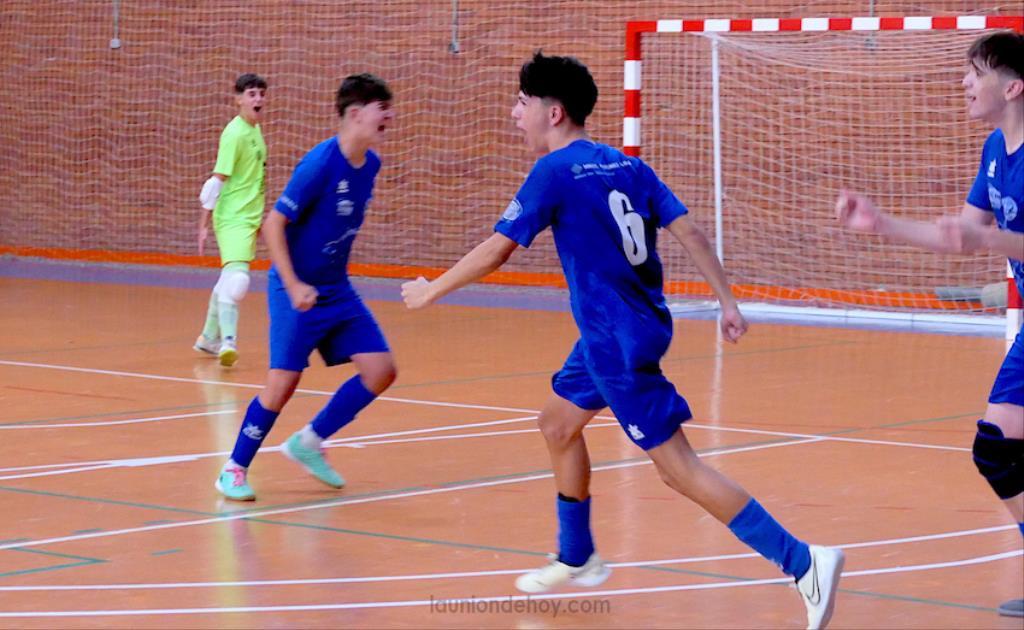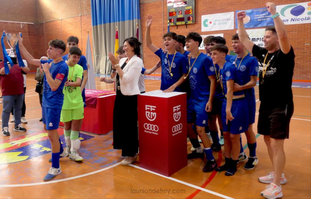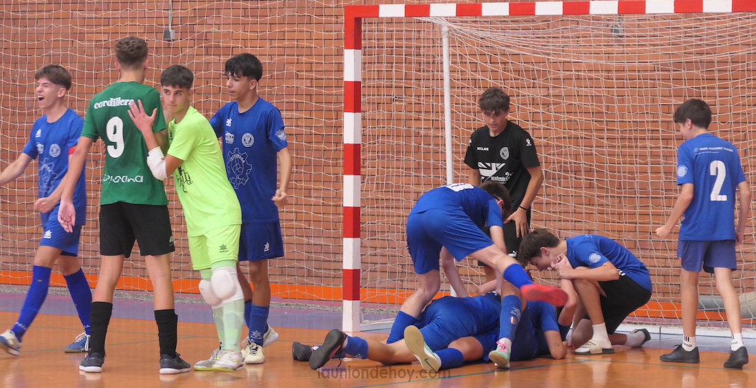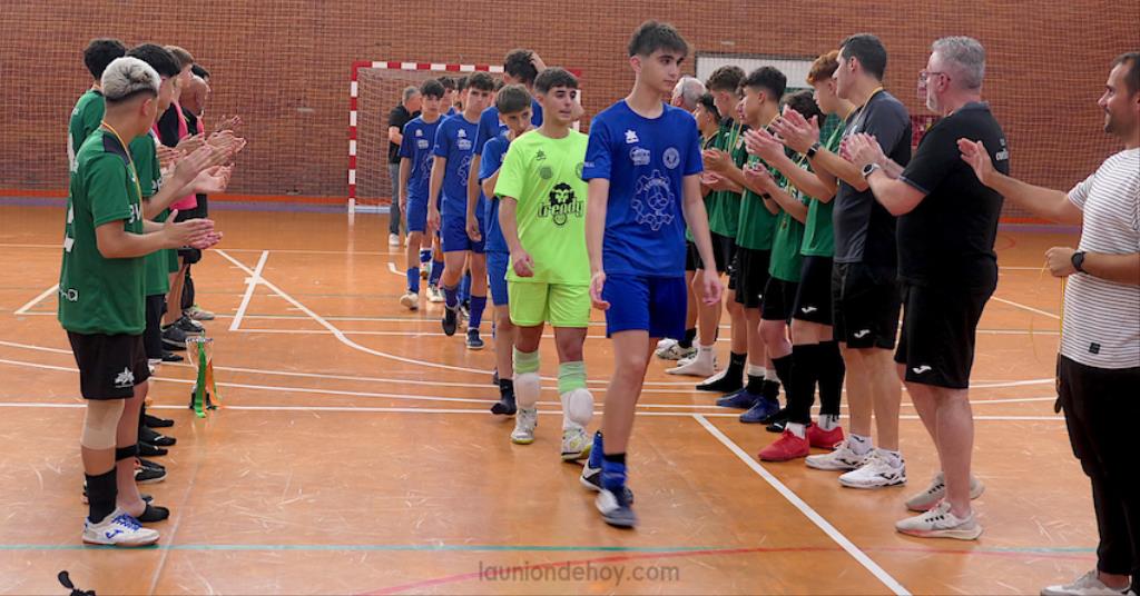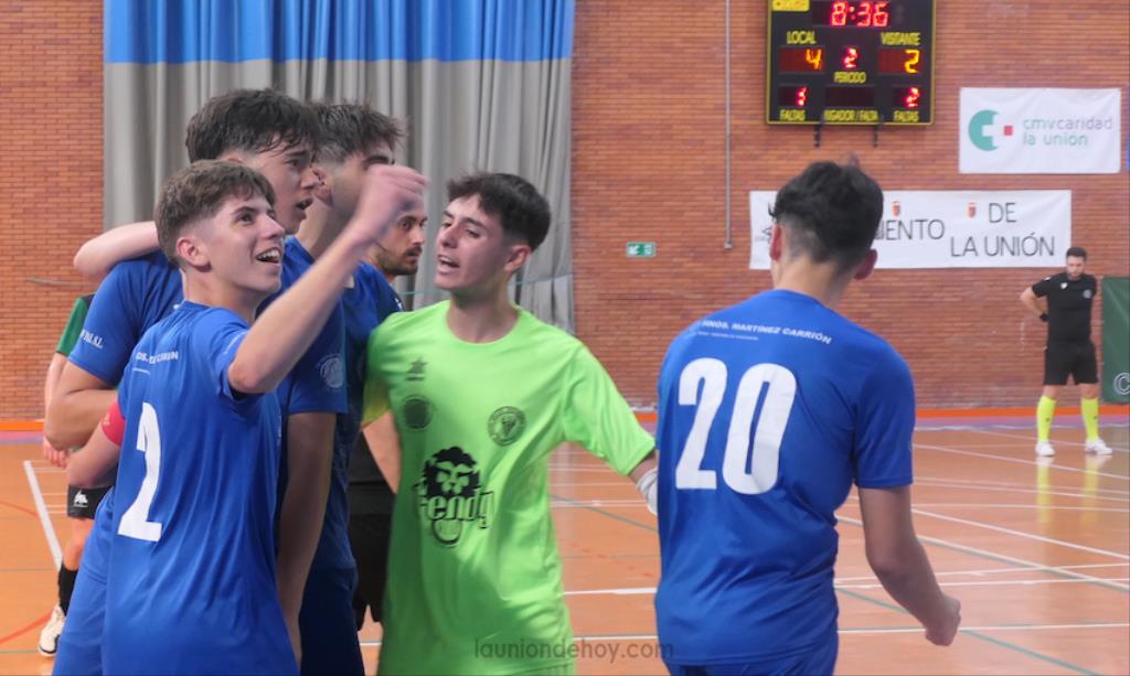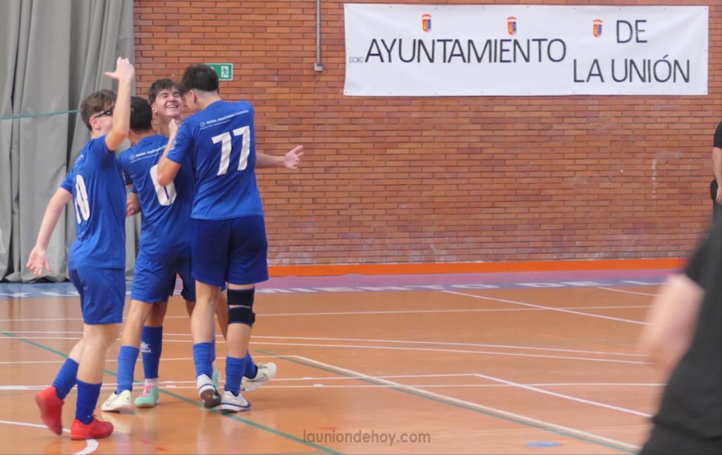 El equipo unionense de fútbol sala derrota a un CD Cordillera que le había ganado los dos partidos de liga y alza la copa regional cadete ante más de cuatrocientos personas en el pabellón de La Unión. En la foto, escena tomada nada más acabar el encuentro donde se observan el júbilo local, la resignación murciana y la deportividad entre ambos.