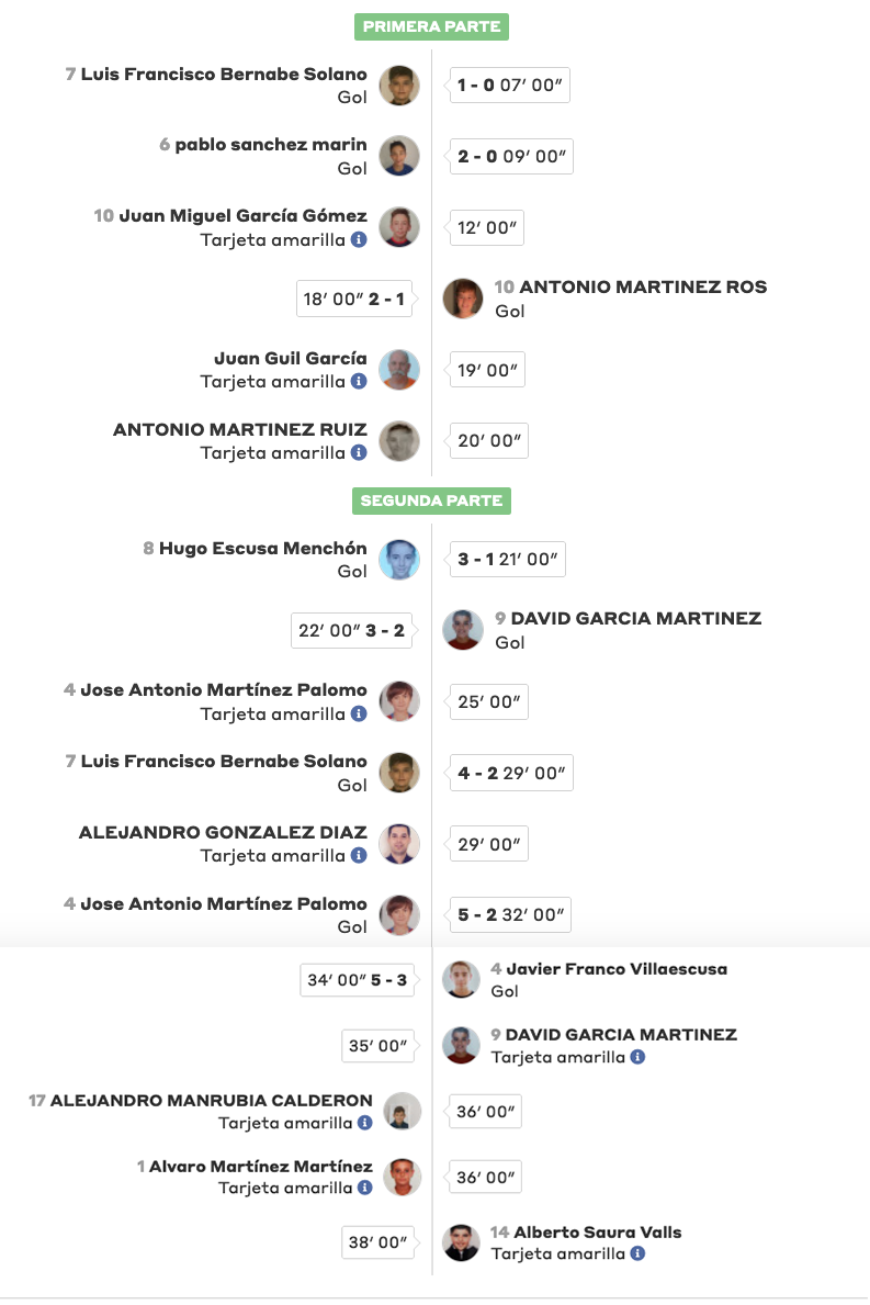 GOLES. 1-0. Minuto 7: Luis Francisco Bernabé. 2-0. Minuto 9: Pablo Sánchez. 2-1. Minuto 18: Antonio Martínez. 3-1. Minuto 21: Hugo Escusa. 3-2. Minuto 22: David García. 4-2. Minuto 29: Luis Francisco Bernabé. 5-2. Minuto 32: José Antonio Martínez Palomo. 5-3. Minuto 34: Javier Franco.