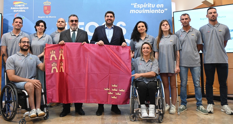 El presidente de la Comunidad Autónoma ha recibido a los doce deportistas preseleccionados para los Juegos Paralímpicos de París, entre los que figura la baloncestista unionense Sonia Ruiz, a quien se observa sujetado la bandera con ambas manos.