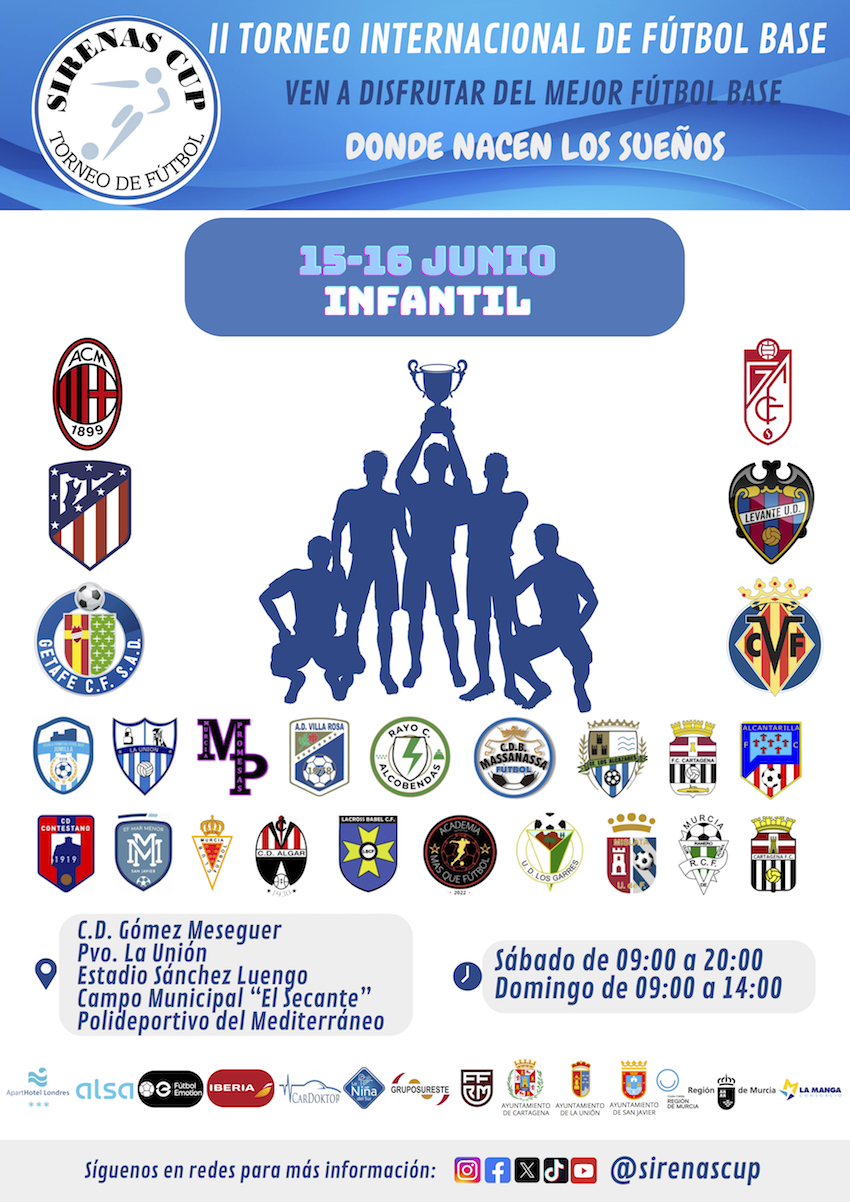 AC Milán, Atlético de Madrid, Villarreal, Levante y FC Cartagena figuran en la relación de inscritos en este campeonato de fútbol base en su segunda edición, en la que tambén está la AD la Unión. Los partidos se jugarán los días 15 y 16 en cinco escenarios, entre los que está el polideportivo Antonio Sánchez.